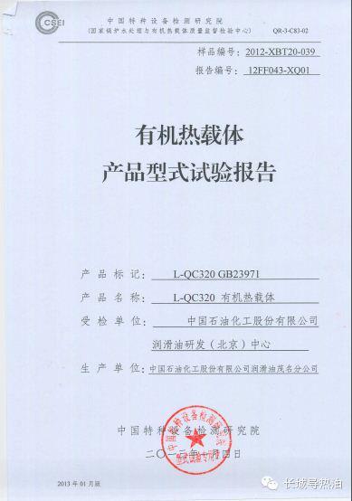 第三,選擇導熱油要看油品的質量,只有通過國標要求的產品才是合格產品,國內導熱油的權威評定機構為中國鍋爐水處理協(xié)會,為符合國家標準的產品提供產品認可證書,如長城L-QC320礦物油型導熱油型式試驗證書如下: